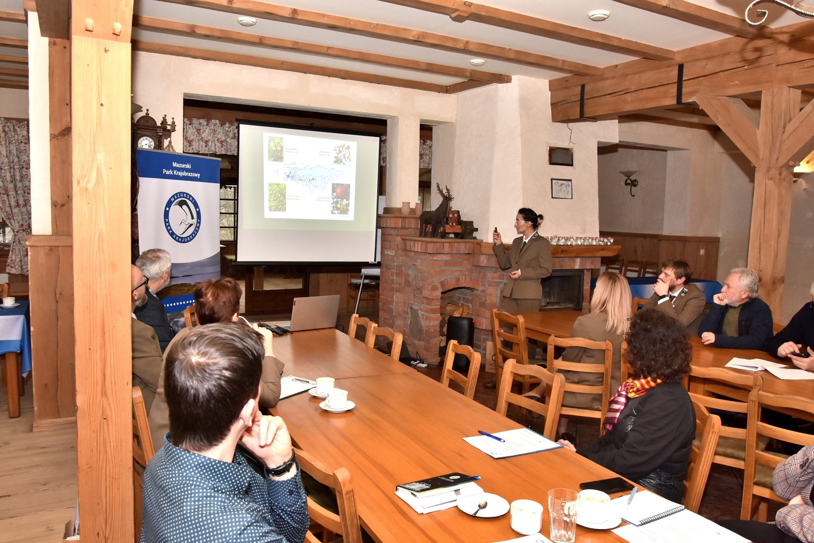Jednym z głównych punktów obrad było przedstawienie działań z zakresu małej retencji na terenie użytku ekologicznego „Polder Woźnice”, które zaprezentował Jakub Masiarz. Następnie Magdalena Chmielewska omówiła projekt pn. „Inwentaryzacja starych sadów i przydrożnych drzew owocowych na obszarze Mazurskiego Parku Krajobrazowego”.