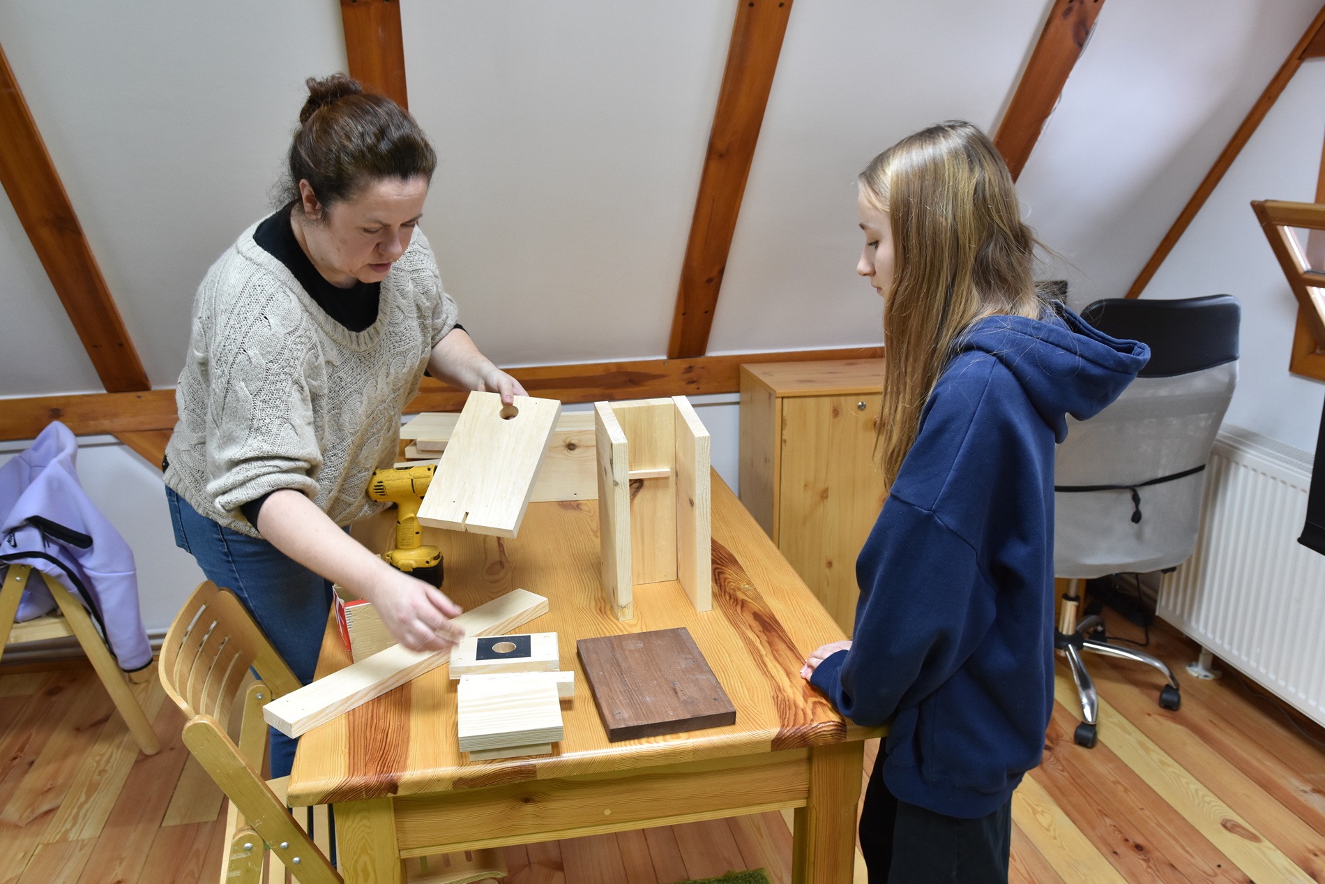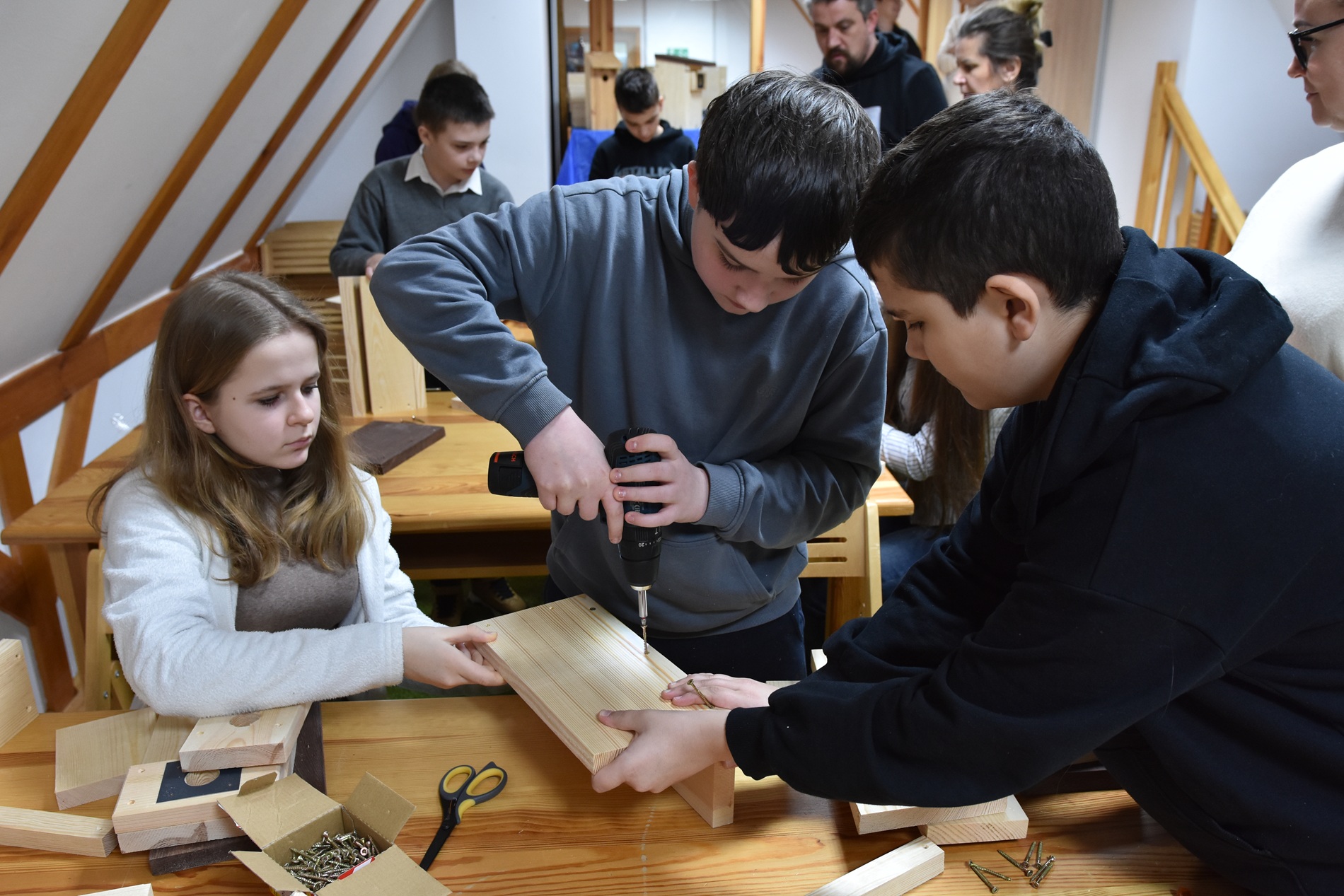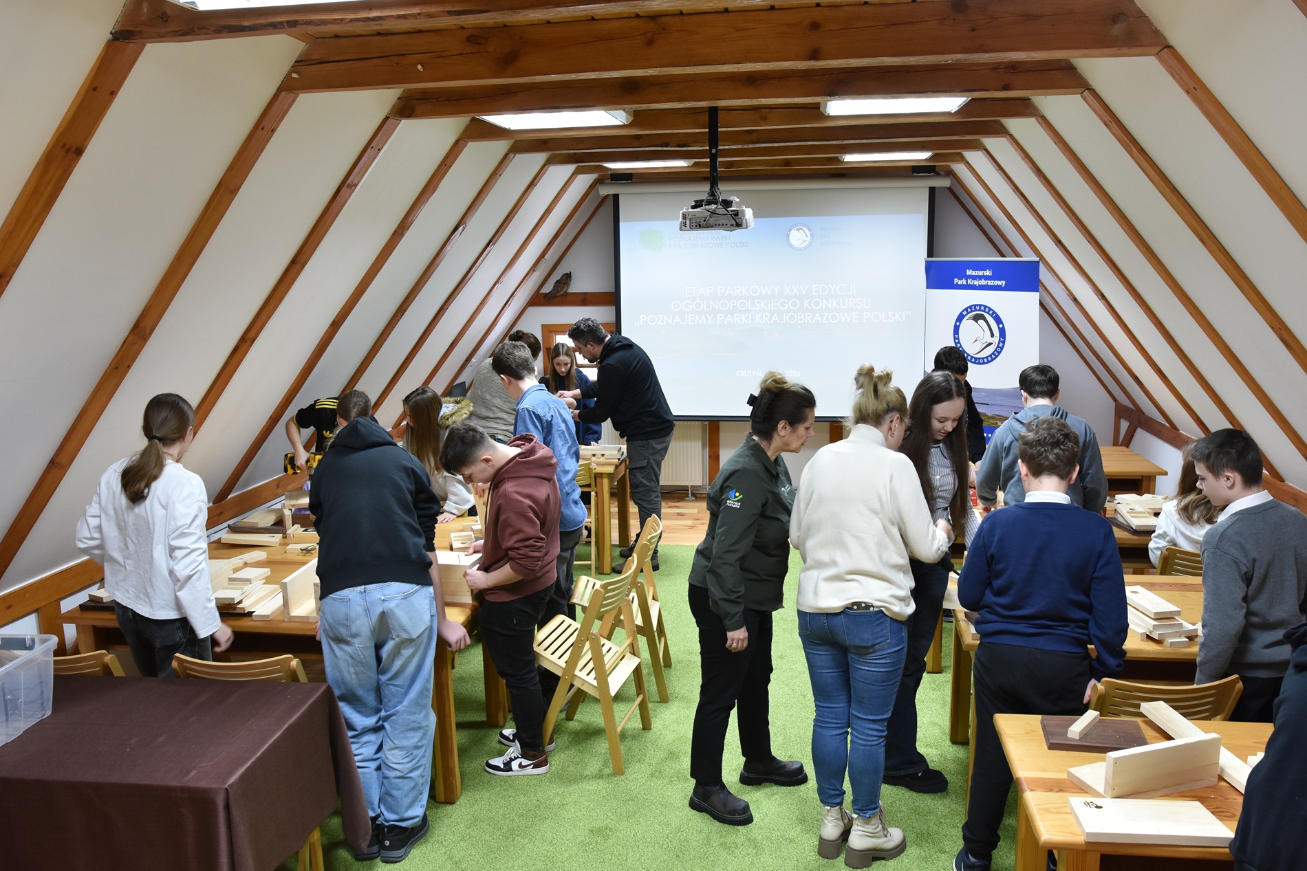 Po części konkursowej przyszedł czas na warsztaty budowania budek lęgowych – każda drużyna wykonała własną budkę, która już wkrótce może stać się domem dla skrzydlatych mieszkańców.